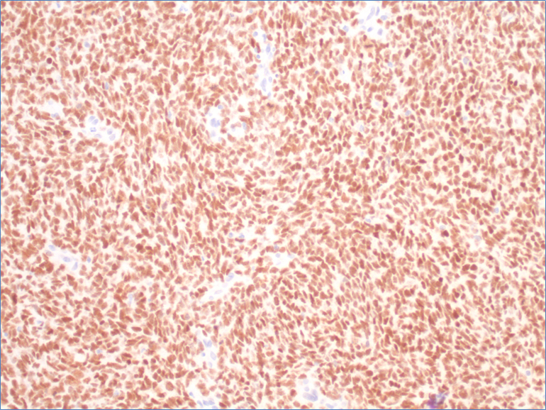 - A subset of leiomyosarcomas (20%) can demonstrate weak to moderate staining in a subset of tumor cells (<5% to 40% of tumor cells).